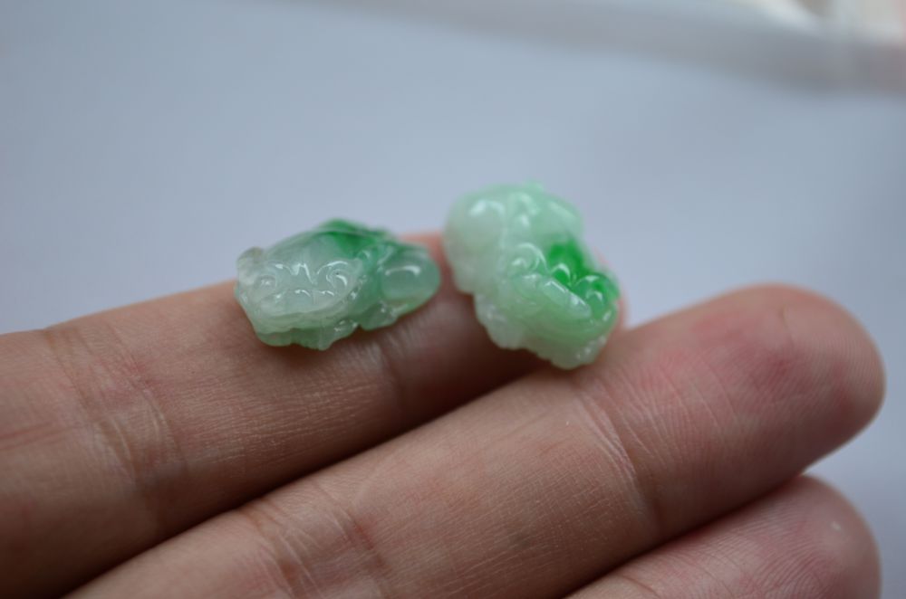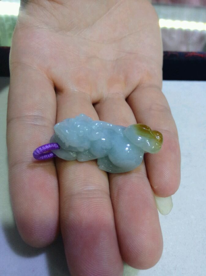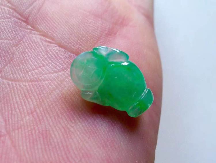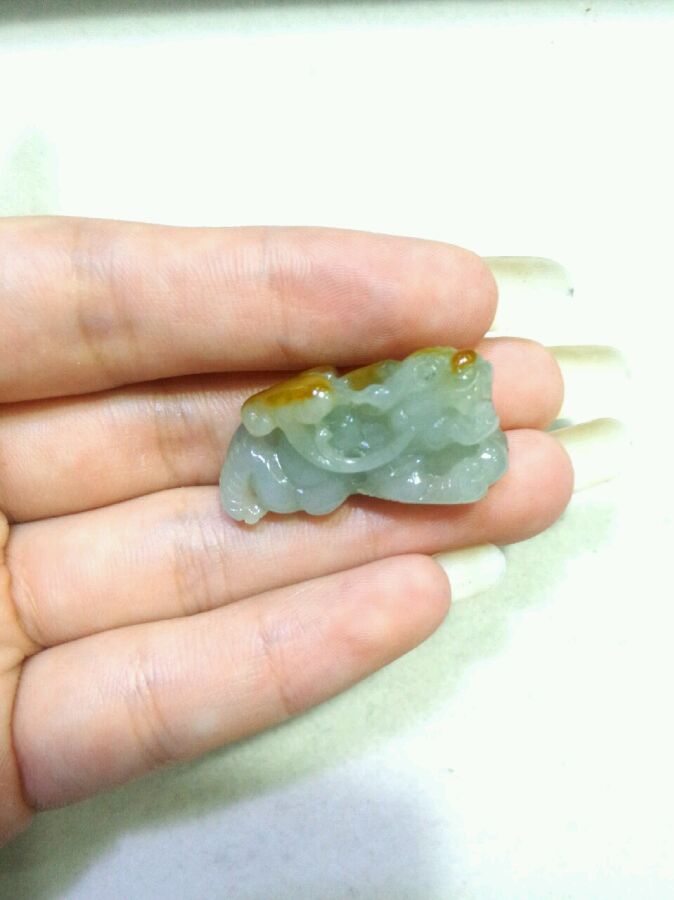 飘绿貔貅,质地幼腻,种好水足,有线纹,不明显不影响佩戴效果。揭阳阳美玉都纯手工雕刻工艺