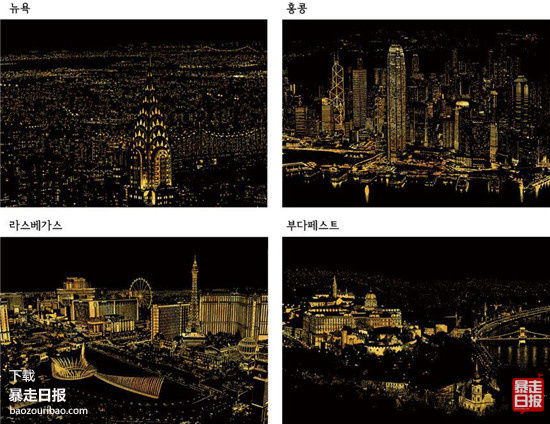 随着涂色绘本《秘密花园》的走红,越来越多的人开始使用涂色的方式释放压力。《Scratch Night View夜景刮痕》系列刮本,是以各大知名风景点为范本,图上是一整片的铝粉,读者用笔依轮廓刮下覆盖的粉面,底面透出金黄的光线,美丽夜景,在刮笔下被点亮。