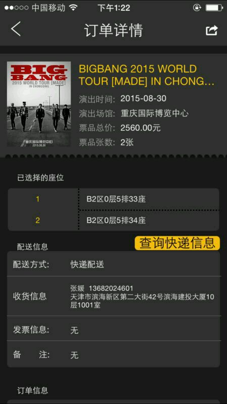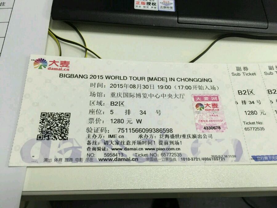 出8.30重庆 BIGBANG巡演两张联座票B2区前排
