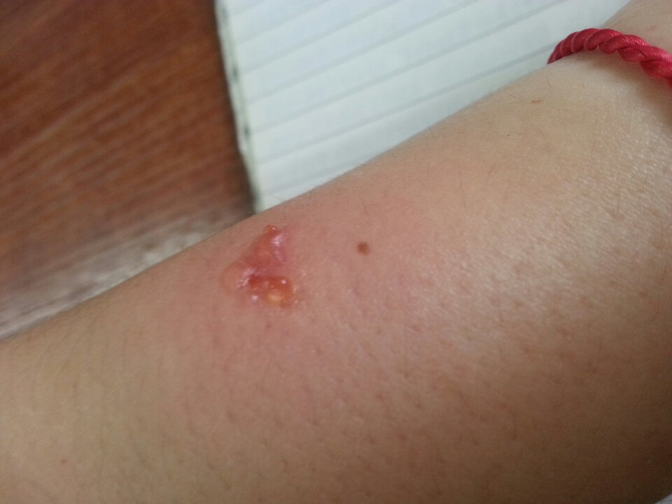 先是一个硬包,痒,抓了后有小水泡,挤了流黄水,手上有两个,腿上有几个,谢谢帮忙
