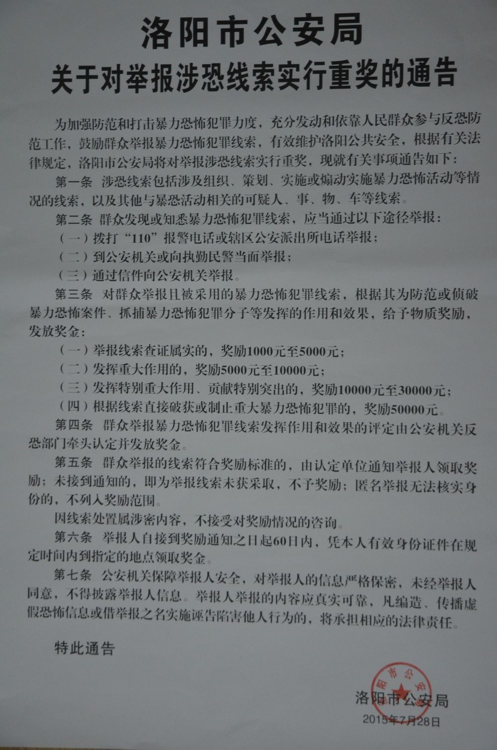 洛阳市公安局关于对举报涉恐线索实行重奖的通告