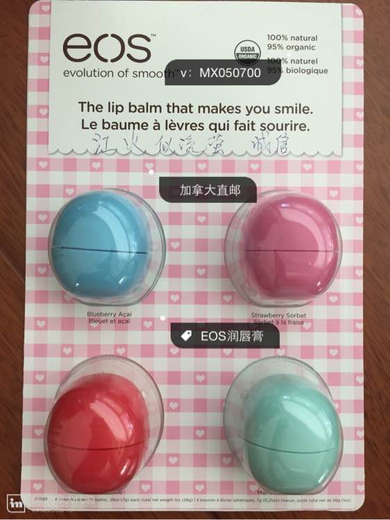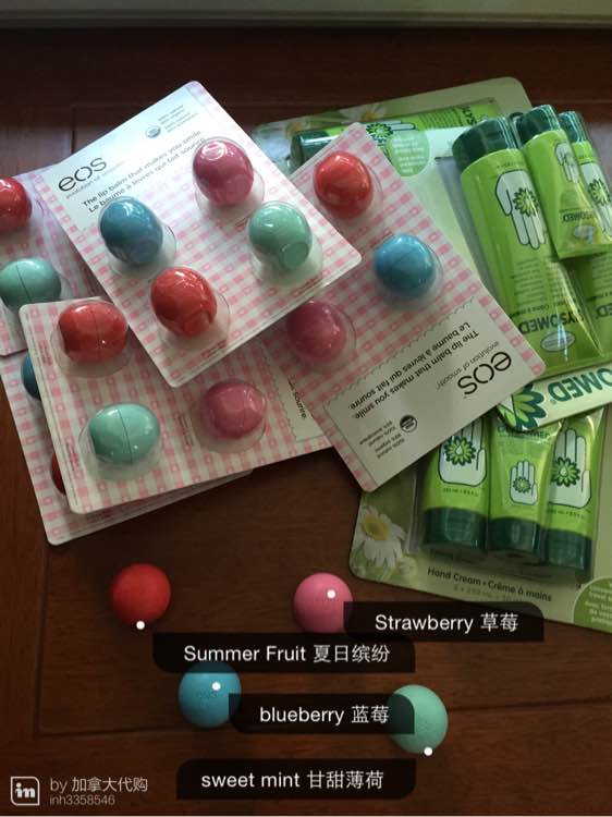 加拿大直邮。EOS润唇膏四个一盒,每盒¥110,两盒¥200,包邮哦亲!Glysomed洋甘菊护手霜每盒含两瓶250ML和一瓶50ML,一盒¥140,两盒¥260都包邮哦!