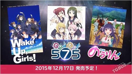 本作目前已经定在12月17日发售,游戏将收录《摇曳百合》、《潜行吧奈亚子F》、《绯色战姬》、《黄金拼图》、《苍蓝钢铁的琶音》、《探寻吧!部活! 第二季》、《Wake Up, Girls!》、《GO!GO!575》、《农林》、《未确认进行式》、《请问您今天要来点兔子吗?》十一部作品,采用与《初音未来歌姬计划》基本相同的玩法。