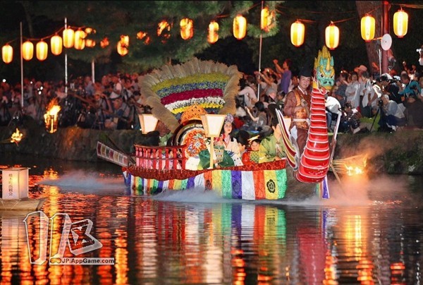 祭典当晚,猿泽池中河灯在明月下闪烁,两艘管弦船缓慢地在水面上前行。身着和服的“花扇使”把用7种秋天的草装饰的花扇投入池中以示祭奠。