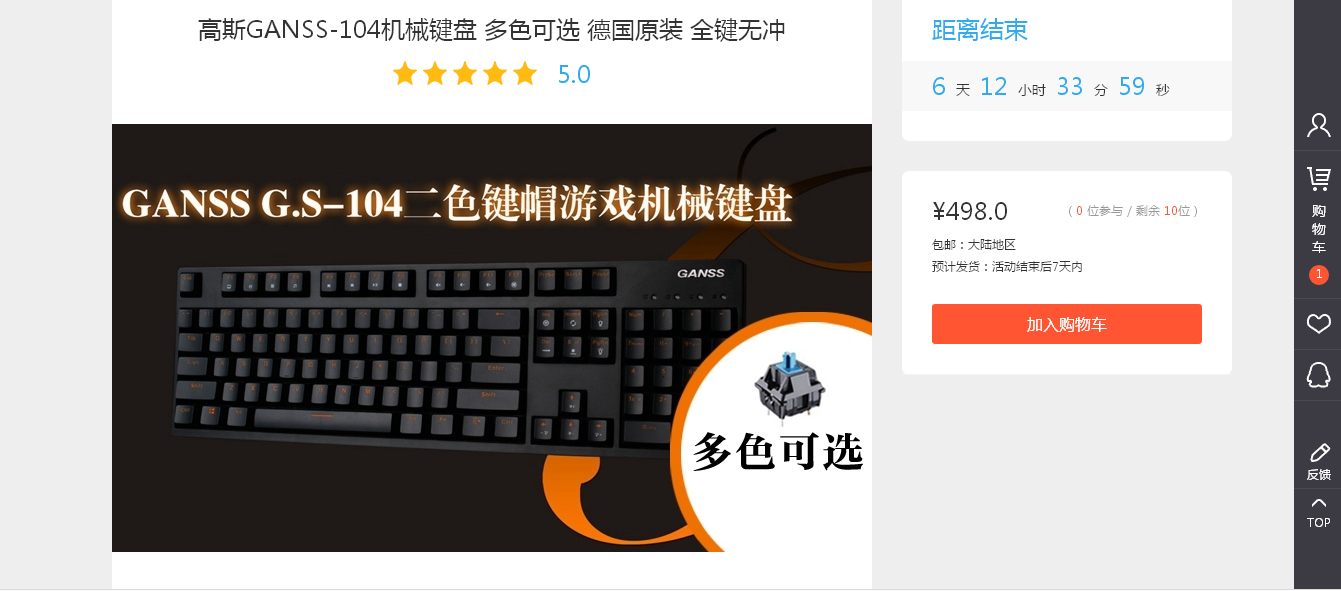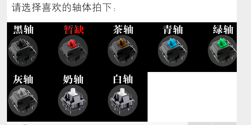 选择轴体的方法为;拉到页面最下处,点击图片选择,价格为Cherry黑轴498 青茶528 奶白灰绿598 红暂无。使用QQ淘宝或微博账户即可注册商城账号,支付宝可付款。购买流程及键盘介绍如下: