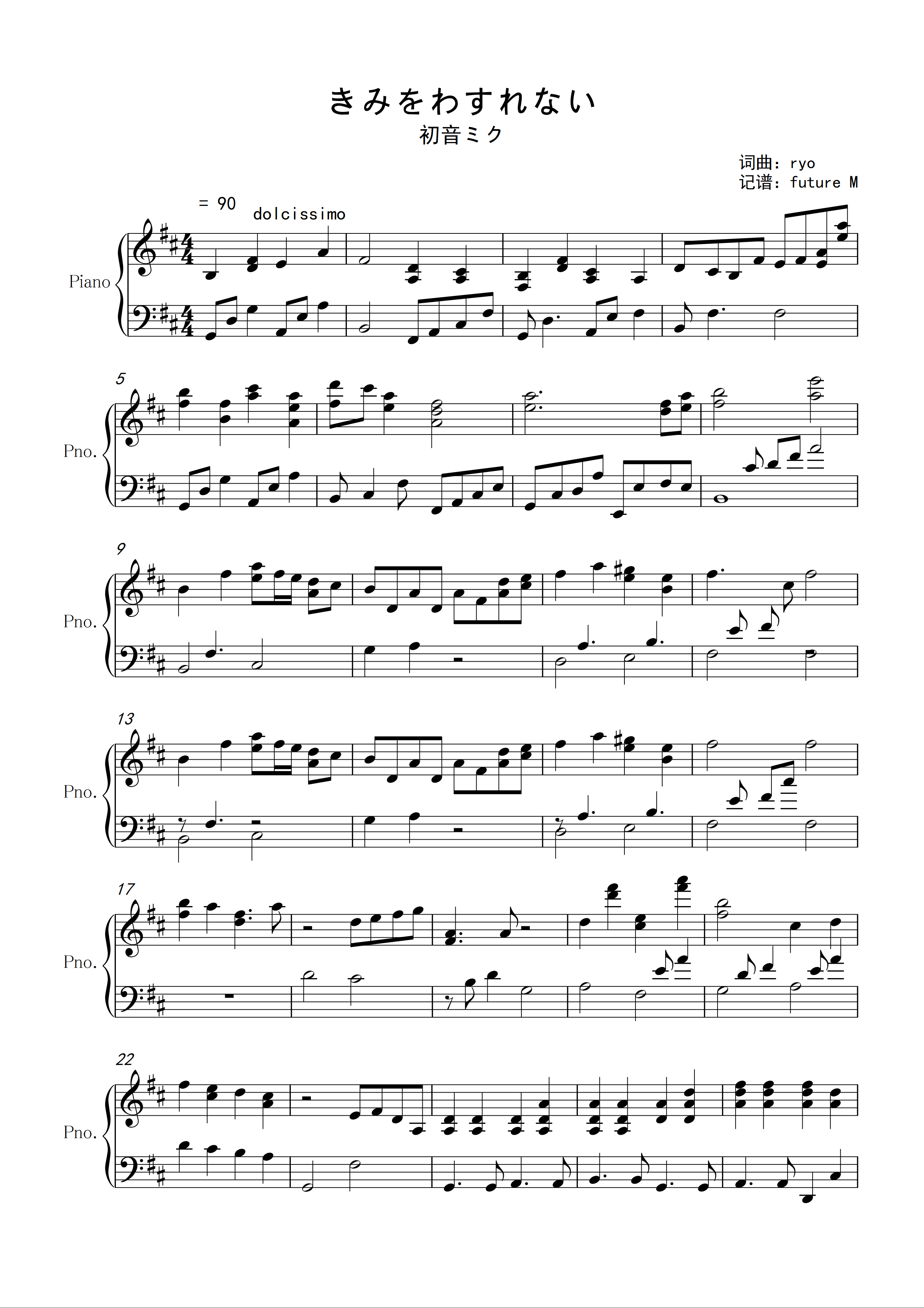 最近一直在学钢琴的作曲,就想起了ryo的这首老曲(收录在melt那张专辑中),于是就把它的谱子完整地扒了下来,想了想还是发上来好了(大家如果有兴趣可以自己弹弹看)。这首曲子真是好听啊,无论是miku的声音还是钢琴的作曲,都感情深厚,无可挑剔(啥时候我能写成这种水平就好了······