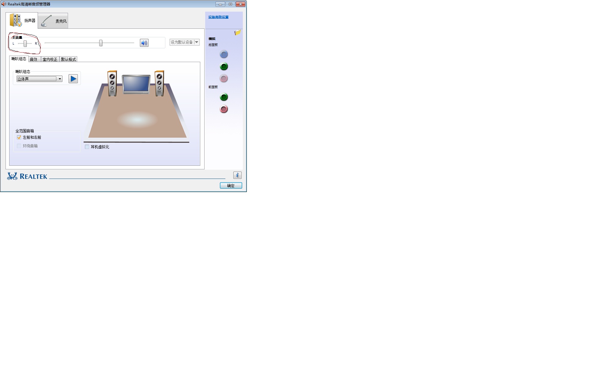 电脑一直是前面插耳机,后面插音箱,声音一直也很正常,最近一段时间,孩子没事就喜欢把耳机拔下来插上去来回玩,现在导致耳机听歌,声音很空,感觉像在很远的地方。玩CS的时候,能听见脚步声音,但是听不见自己开枪的声音。把耳机插到后面则一切都正常,于是我就怀疑是前面的插孔坏了,但是在声音调节里面,我把如图中所圈的主音量拉到最右边,则声音什么都有了,游戏里的声音也都有了,只是声音听起来有点别扭,不知道问题出在哪里?