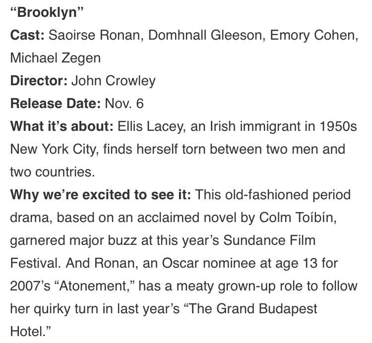 NY, 1950s, 一位爱尔兰移民姑娘的三角恋爱故事。对这类片是真正的没兴趣,回避。