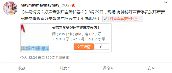 @Maymaymaymaymay_:【神马情况?好声音张玮空降长春?】8月29日,现场 有神秘好声音学员张玮带新专辑空降长春苏宁鸿源广场云店!引爆现场!