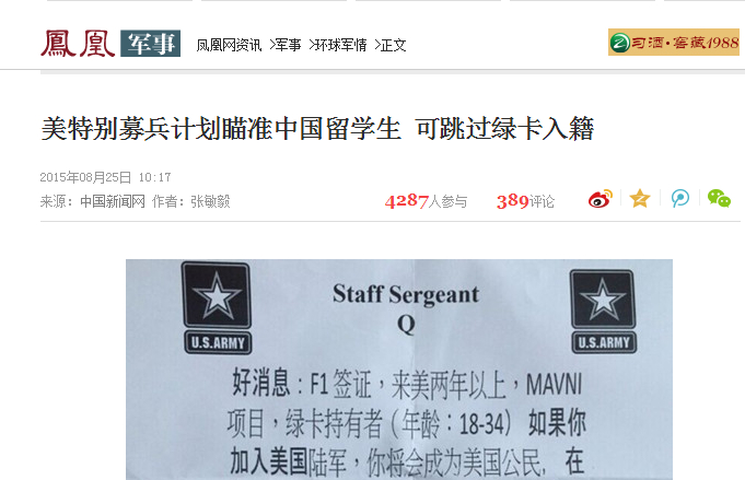 美特别募兵计划瞄准中国留学生 承诺可快速入籍