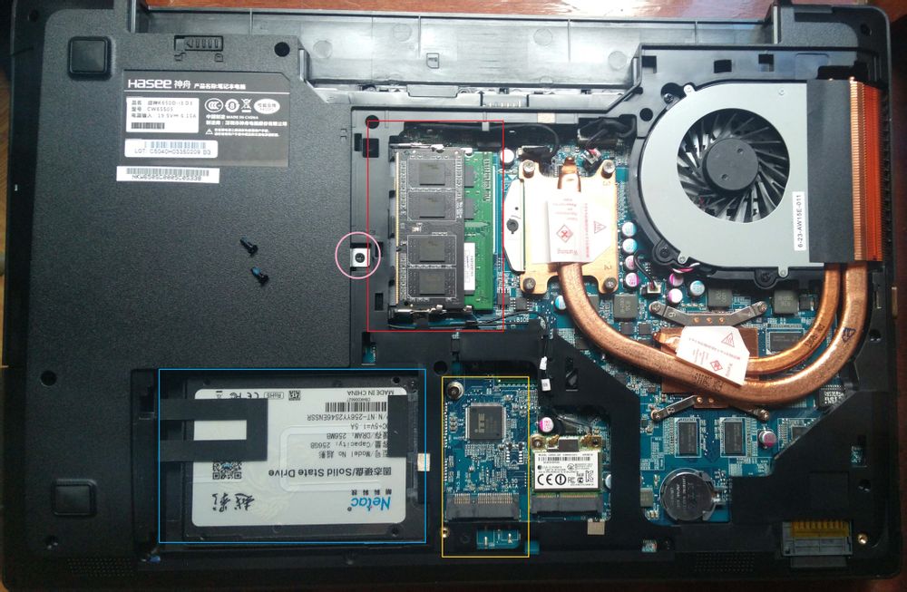 蓝框内是硬盘,这硬盘位也是坑爹啊,没固定的,直接用海绵塞住的。换上固态后发现固态太薄了,往下吊着的,长期这样使用对接口肯定有影响啊,可能稍微不注意硬盘就松了,没办法,只要在硬盘下面垫了几张纸片。昨天看见有人垫心相印的,哈哈!