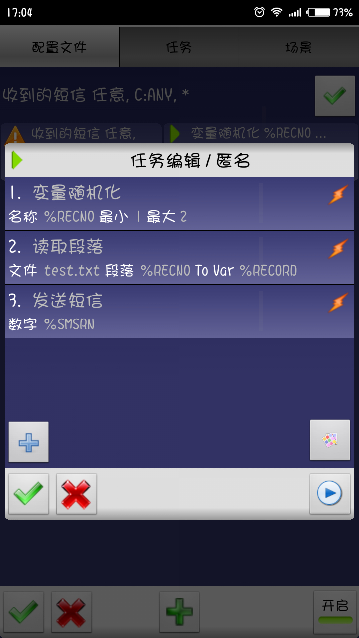 我需要这个功能是因为工作上会收到一些系统发出的短信需要我回复某些内容,但是系统发出的短信发送号码都是不一样的,是按日期时间自动生成的号码段,短信中有一个共同点是短信内容里都有一句“提醒您收取集中化故障处理工单”,不知道Tasker有没有设置检测收到的短信内容为包含某些字段的命令,或者朋友们还有什么别的方法,求教,谢谢!!!
