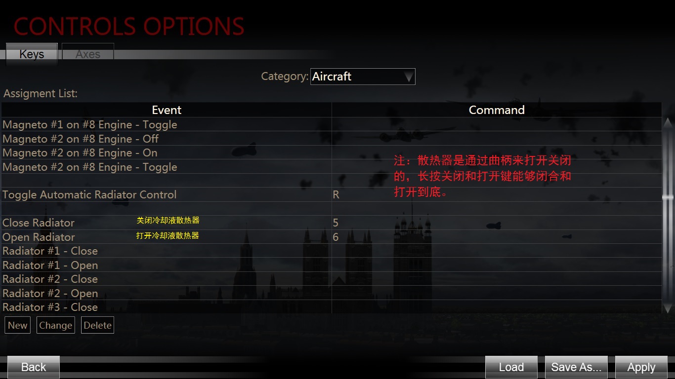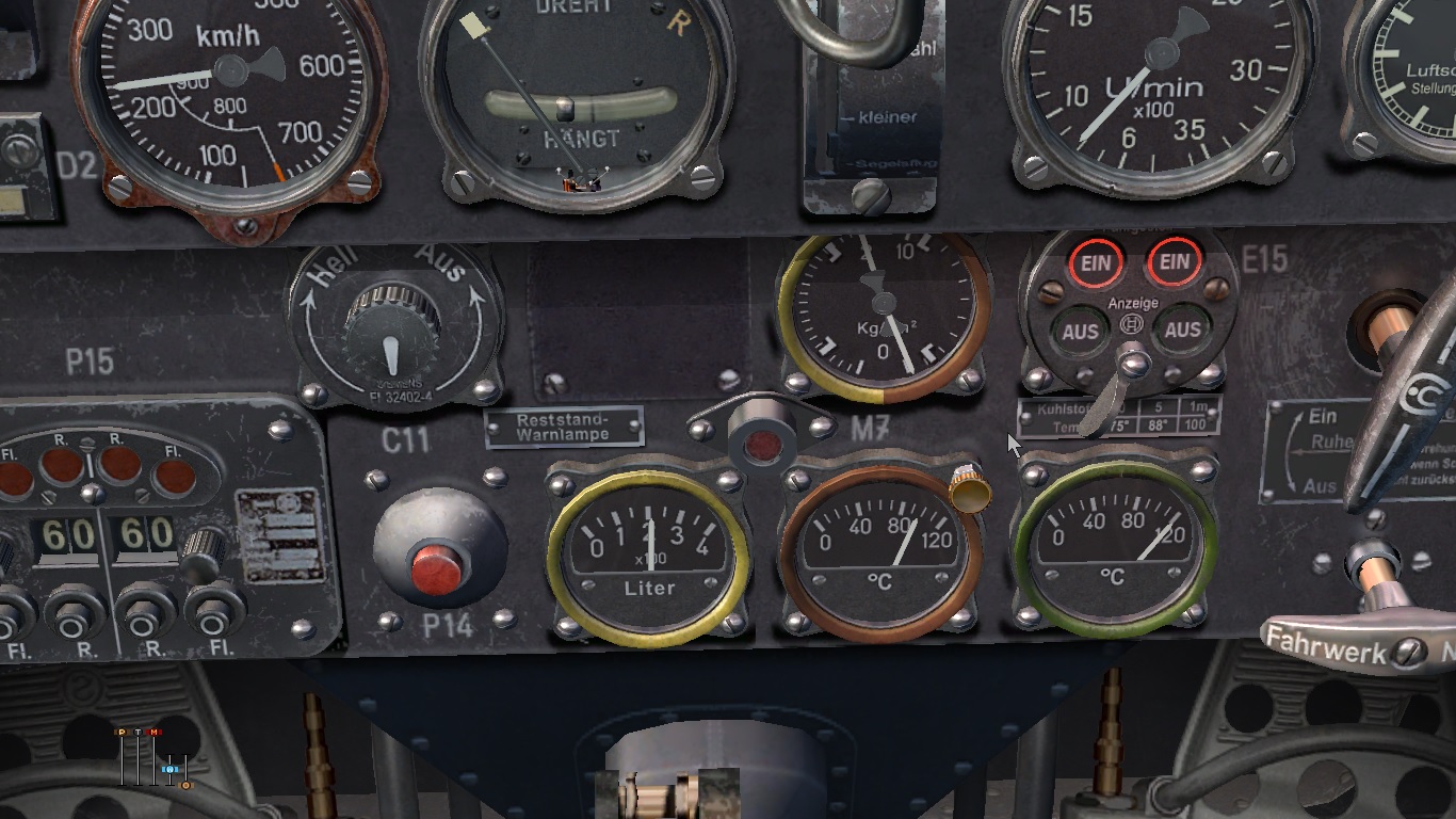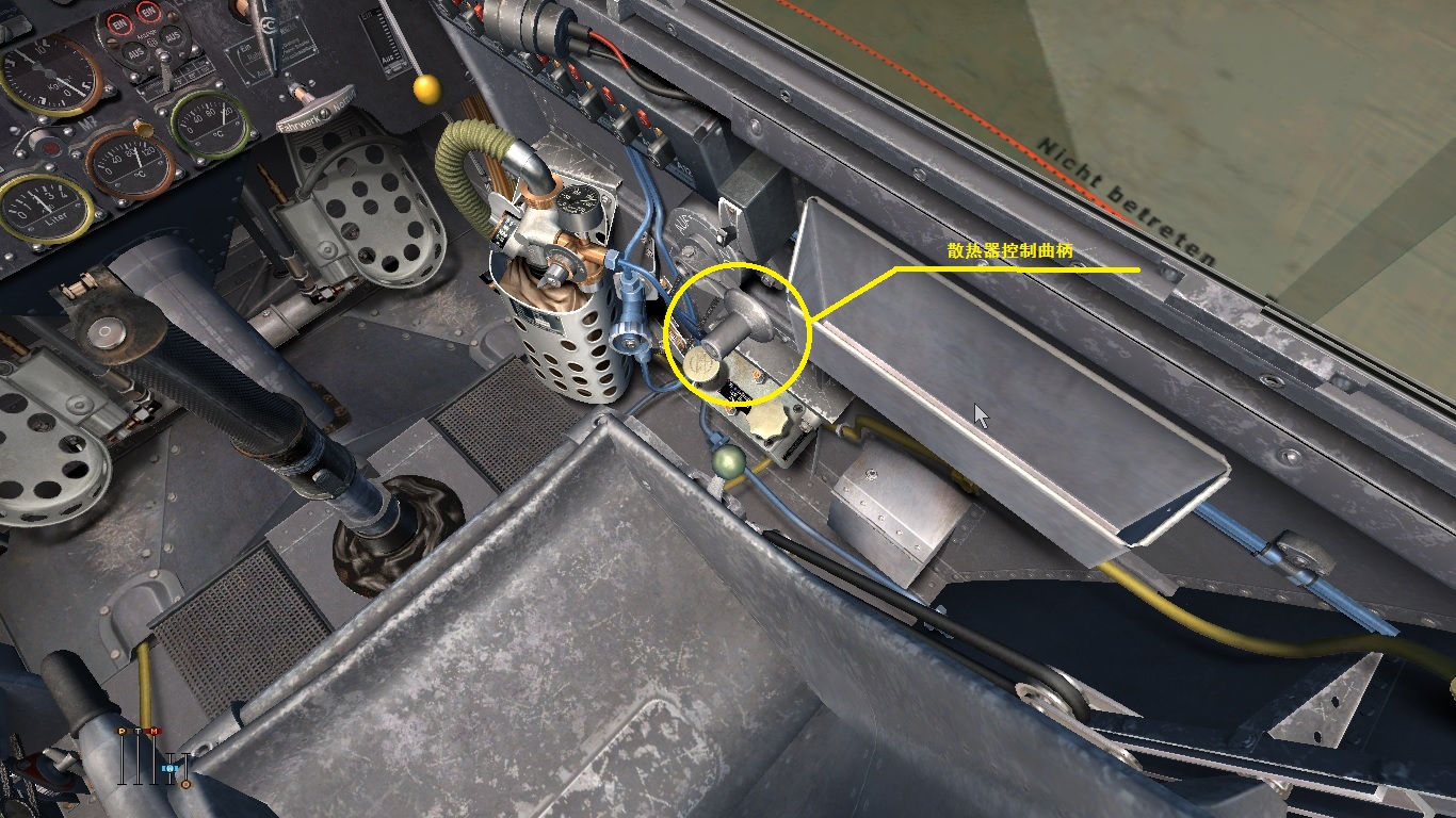 关于发动机的管理,如果在难度选项中选择了Complex engine management(复杂发动机管理)选项,那么游戏的难度和真实性将大大提高,水冷发动机工作时,冷却液是为了带走气缸热量,滑油是为了减小零件摩擦,两者均设有散热器来控制自身温度,如果温度过高,冷却液将沸腾蒸发,滑油油膜也会破裂失效。所以在巡航飞行中,一定要保证散热器适度的打开,即使在战斗中,也应该时刻关注两者的温度状态。