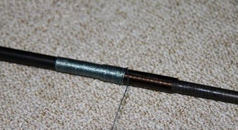 5.好了,到了这步基本已经有了原路亚竿的坚固了,可是还不够,我们把PE线用上,在外面绑上一段,防止裂开(虽然裂开的机会不大),为了更好的加固,如下图,绕线方法和普通路亚竿换前导环绕线一样,不懂看下图片;