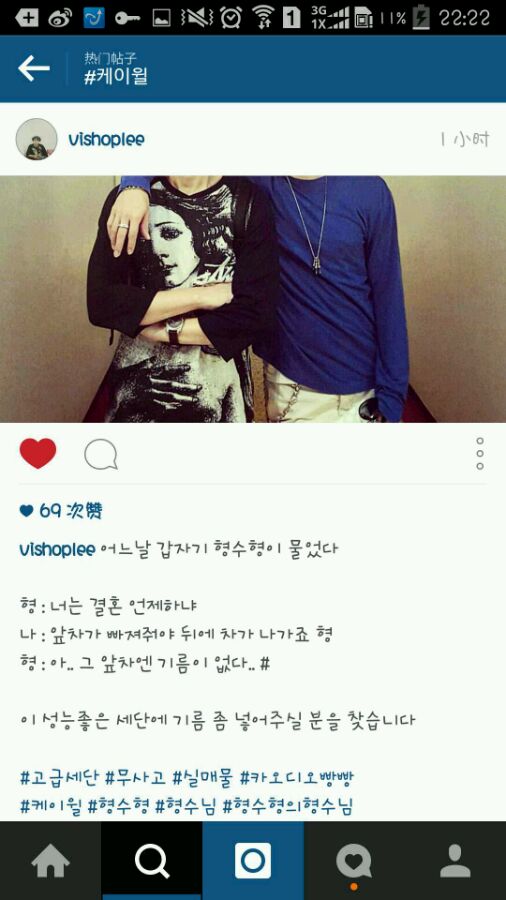 相关instagram翻译:有一天,我突然问炯秀哥。哥:你什么时候结婚?我:前面的车让开了,后面的车才能出去啊,哥。哥:啊..前面的车没油了.. 要找一下给这辆性能优良的轿车加油的人