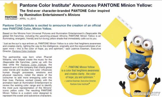 小黄人的颜色,已经被世界最权威的色彩研究所“彩通”(Pantone Color Instituter),加入色卡。这是全世界首个以动画人物为灵感,生成的颜色。叫——小黄人黄(Minion Yellow)。这种颜色代表着“希望和乐观”。