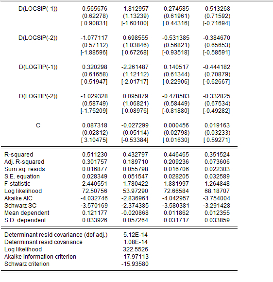 eviews做的VEC模型的结果怎么看系数显不显著