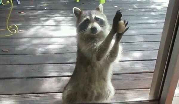 美国浣熊母亲拿石头敲门为幼崽讨食物!
