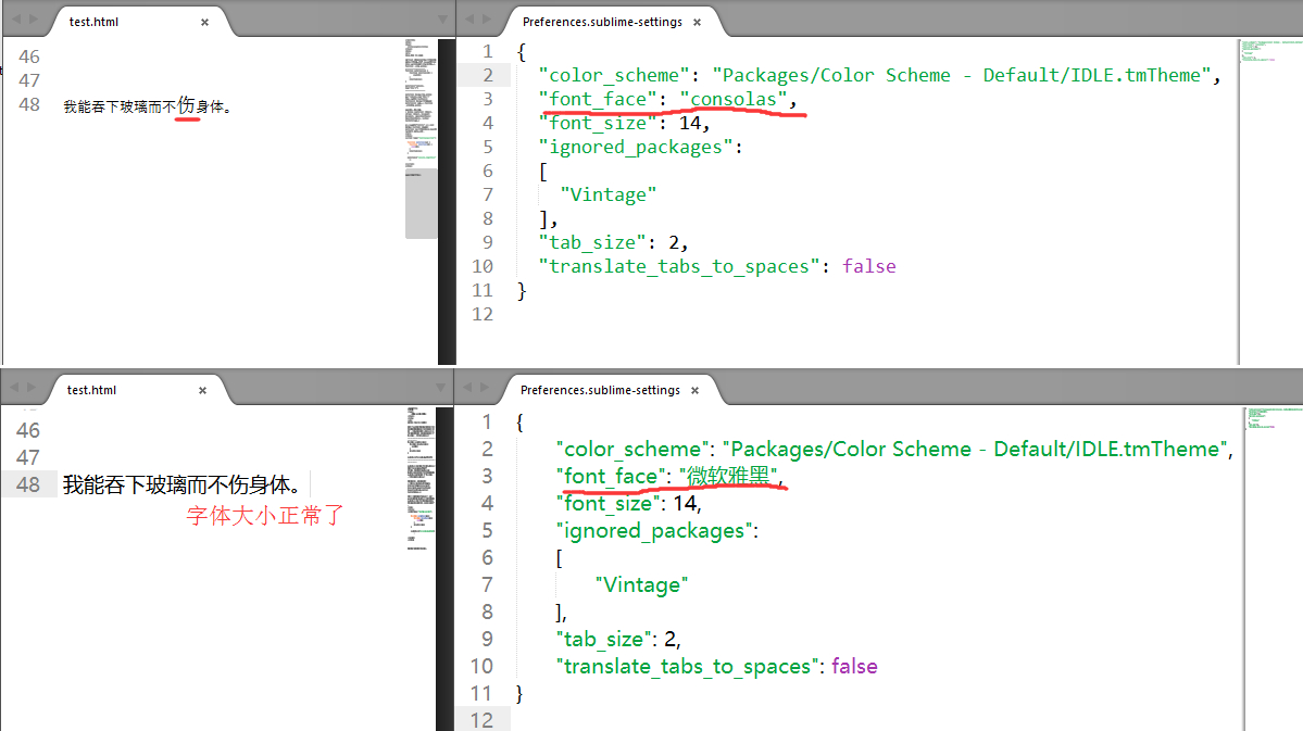 如图,不晓得是 Win10 的问题还是 Sublime Text 3 的问题,如果我设置的字体中不包括中文字体,似乎就不能正常显示,而是字体大小忽大忽小。在我安装其他程序或者使用其他程序的时候,也会遇到这个问题,所以我也不能确定是不是 Sublime Text 3 能够解决的问题。