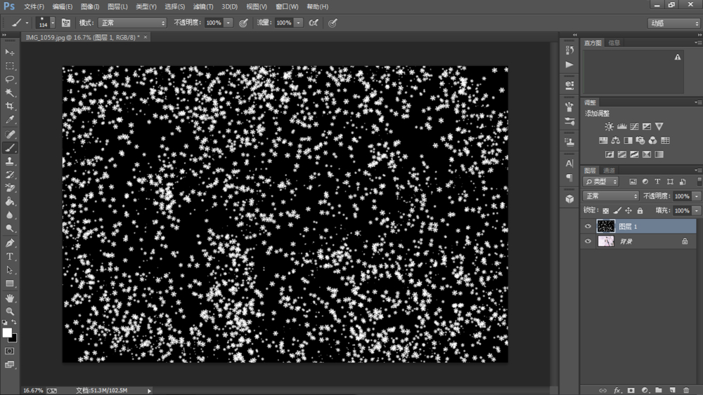 在黑色图层上用雪花笔刷刷出雪花,没有笔刷的可以直接普通画笔