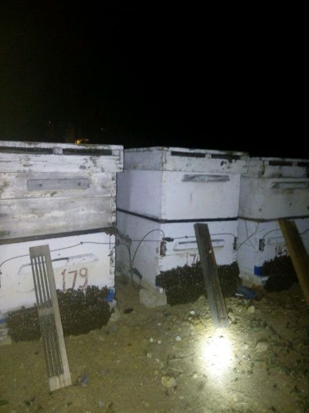 关王前继箱上饲料己慢喂至封盖,关王挂在继箱蜜脾中间,注意两王不能挂同一条蜂路。 断子治螨后,择机抽出底箱空脾,让蜂在继箱上,换下底箱铲出蜂蜡蜂胶,清理干净,用火焰喷枪彻底消毒,白天最高气温降至16度左右时,蜂群盖六层遮阳网开始控飞,强冷空气来临前将蜂和脾落到底箱。