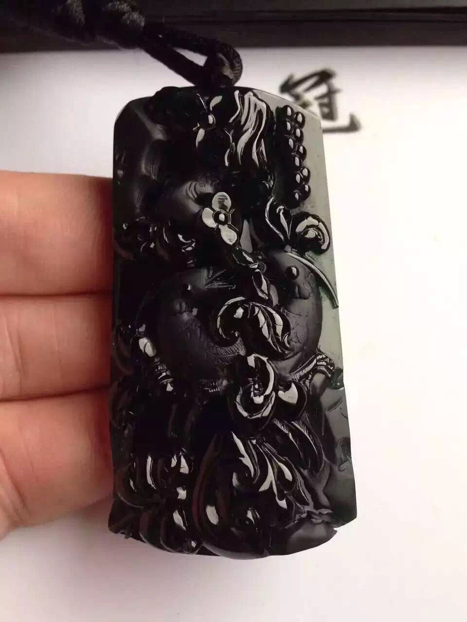 精美墨翠,竹林观音,饱满厚装,色泽乌黑,雕刻精致,透绿,批发价2.3万 尺寸53*45*6毫米,喜欢私聊[MOBILE PHONE WITH RIGHTWARDS ARROW AT LEFT]