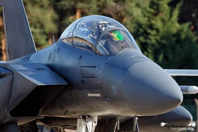 F-15 机身两侧安装有平直的进气道,带二元压缩进气口。进气口稍稍远离前机身以避免吸入附面层,从而省略了复杂的附面层隔板设计。进气口前缘斜切,在大迎角时可获得充足的进气量。进气口底部有铰链可在飞行中向下偏转以改变进气口面积,进气口下壁板的迎角可从 4 度到-11 度之间调节。在飞行中大气数据计算机自动控制进气口的偏转,以保证发动机获得