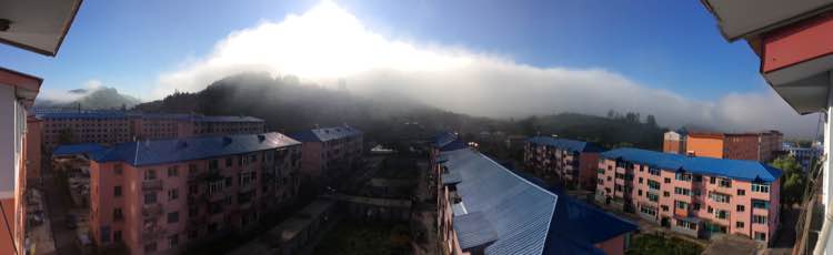 应该是清晨在楼房窗口往东山方向拍的,逆光,幅面很宽,涵盖了廉家沟到黑松沟,左上角应约可见黑松沟的大石砬子,东山主峰被云雾覆盖,海市蜃楼般的仙境,美极!