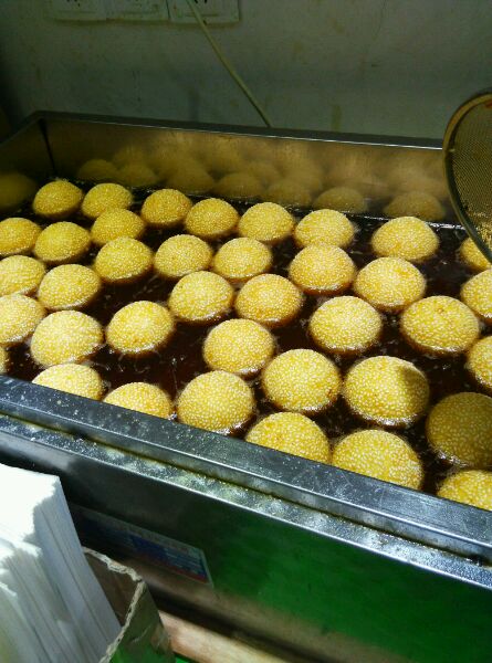 然后包上红豆沙,接下来是比较关键的一步,裹芝麻,两个手同时用力搓,大概是二十斤的力度,以保证芝麻不会掉,一个一个搓好以后就准备下油锅了,油锅要提前打开,大约还剩下二十个剂子的时候,油温控制在一百三十度,油的高度以刚好淹过麻园为准,