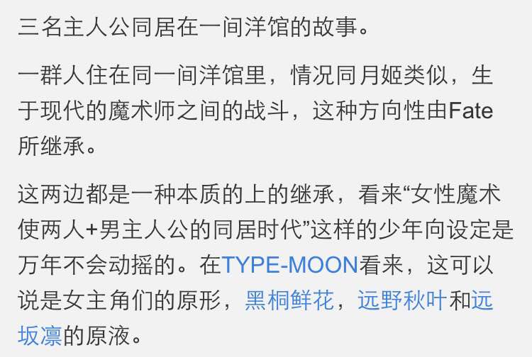 其次,两个魔法女主和一个男主三人同居的模式。fate stay night(凛,saber和士郎)也是继承了《魔法使之夜》的这一设定。