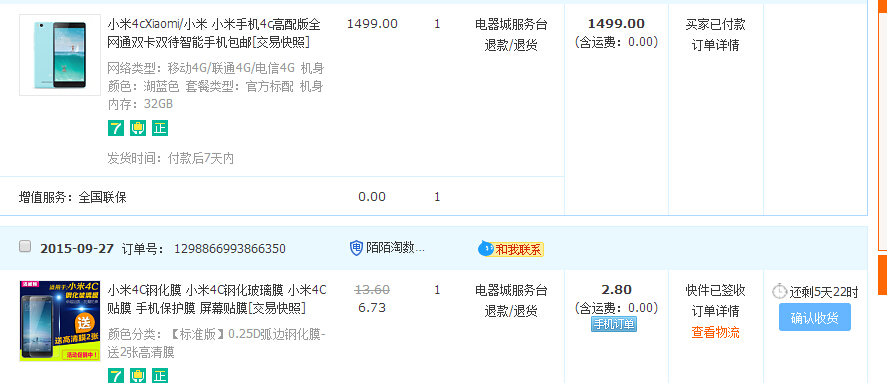 10月2号天猫抢到了高配蓝,贴膜已经提前买了,今天如愿了。提前登录天猫刷新选好到购物车,到点刷新直接下单并花贝付款,亲们就不要去选什么配件了,那样就没法抢到了。前两次都是在小米官网抢,都没得,今天天猫还算可以呀,抢到高配蓝后发现黄和粉色还有货可抢。