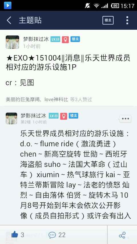 乐天世界成员相对应的游乐设施:d.o.~flume ride(激流勇进)chen~新高空旋转 世勋~西班牙海盗船 suho~法国大革命(过山车) xiumin~热气球旅行 kai~亚特兰蒂斯冒险 lay~法老的愤怒 灿烈~自由落体 伯贤~旋转木马 10月8号开始到年末会依次公开影像(成员自拍形式)或许会有出入
