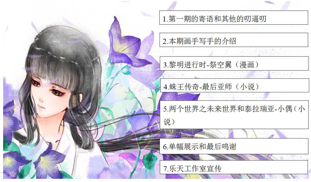当时我第一次来到乐天工作室的时候,整个工作室基本处于崩盘状态,我重新整顿后也算是有了些效果,成功的出了第一期,历时大约一个月的调理,我们也有了一批基础的存货,这期间在努力的也不止是我,也有在漫刊的各位,所以我在这里鸣谢所有在漫刊里奋斗赶稿的人,作为一个学生,在学习压力下还能进行绘画创作,实在是非常不容易