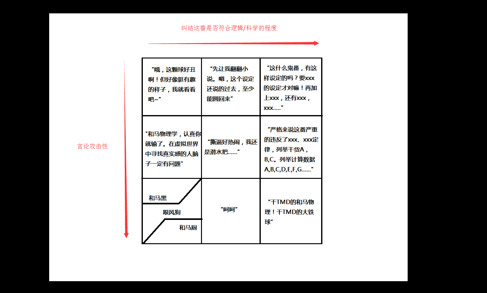 九宫格划分评论立场,从左到右,从上到下,解析各个观众人群,切勿误伤。1-1.追番党,友爱党。言论没有攻击性,也不纠结设定。纯粹的属于“看番真TM高兴”。