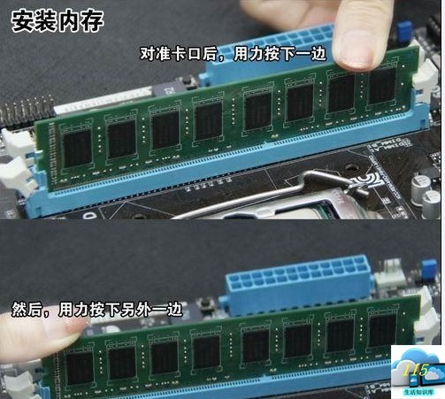 内存的安装很容易,对准内存与内存插槽上得凹凸位,分别左/右用力下,听到“啪”的一小声,左/右卡位会自动口上,然后再用同样方法压好另一边即可。值得注意的是,现在有一些主板,为方便安装显卡,只设置了一个卡位,而安装方法是一样的