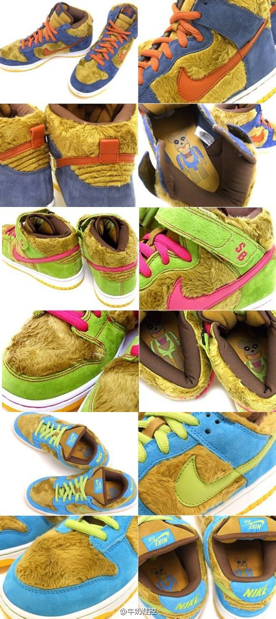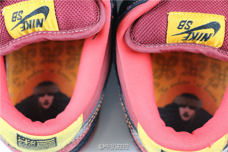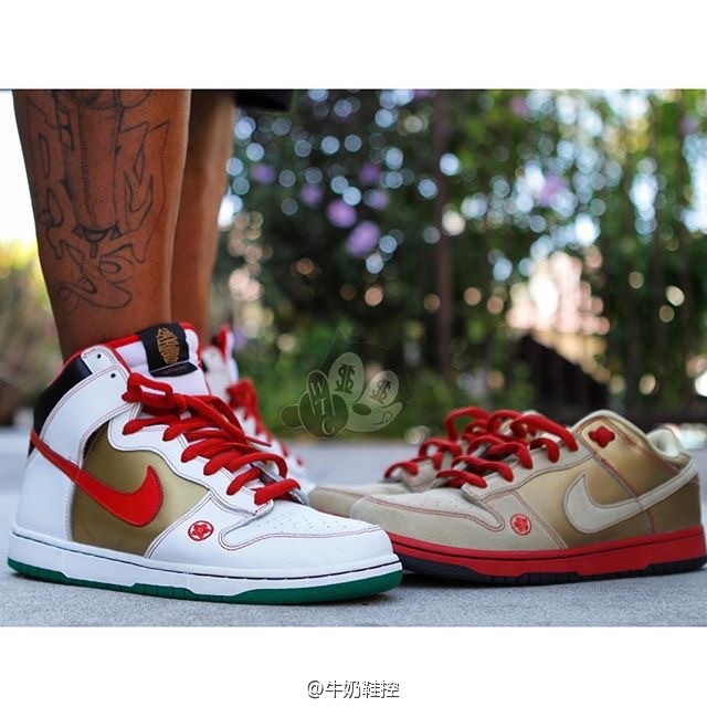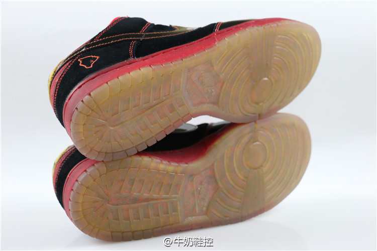 三双鞋的Swoosh logo,鞋带以及内衬都运用了极其鲜亮的颜色,与鞋底的暗色又形成鲜明的对比,颇为抢眼。鞋垫底部的zoom+大块缓震胶是dunk sb的特色配置,给予足底一定的保护作用。LOW的金色部分和MID的黑色部分运用的是光皮,而HIGH的白色则是类似荔枝皮的材料,皮质的差异可以看出现在在同一双鞋上运用不同材料好象已经是NIKE惯用的手法了,这套鞋也不例外。小猫上脚也是这双鞋的特色之一,如此吉祥温暖的主题,喜庆鲜亮的配色怎能不惹人喜爱。