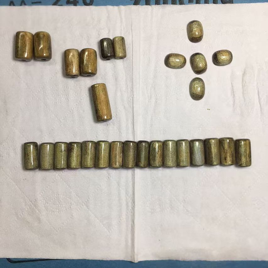 不出!这个是我小时候长辈给我的,以前也不知道是什么,只是这两年才明白是鹤天珠子,大的尺寸22mm,小的16mm