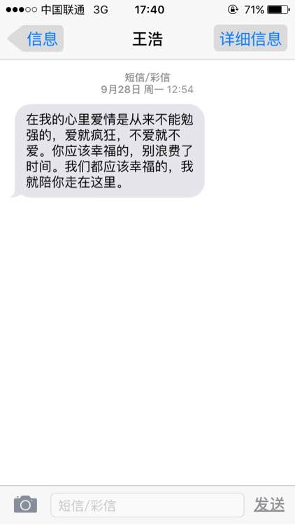 在我的心里爱情是从来不能勉强的,爱就疯狂,不爱就不爱。你应该幸福的,别浪费了时间。我们都应该幸福的,我就陪你走在这里。