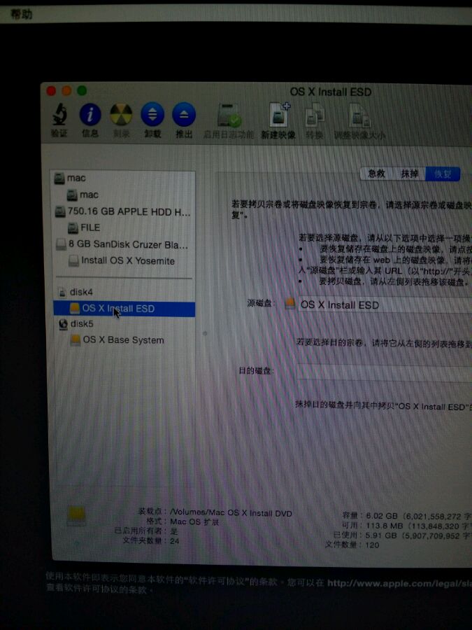 以前坐了一个os x install esd,没用它装而且没有正式推出,还删除了原文件,我用另外的U盘重装了系统,自此,我在后来几次装系统时这个esd镜像总是阴魂不散在recovery的磁盘工具下能看到,但是在系统的磁盘工具下看不到,如下图中的disk4。大神求带!