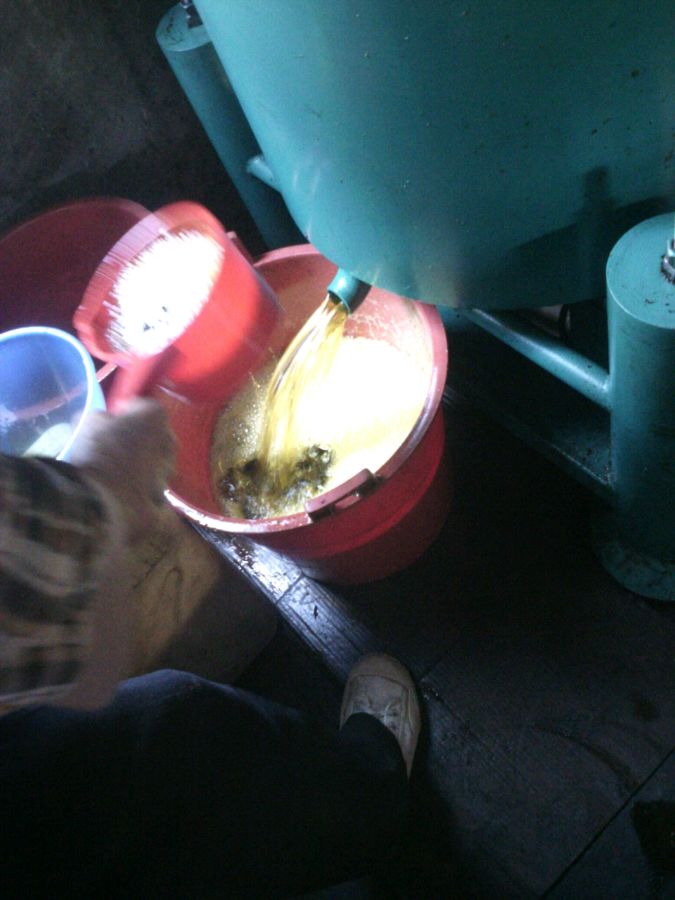 是老头种的,平时偶尔也回家帮忙,今天打了一百七八十斤菜油和八十来斤花生油。