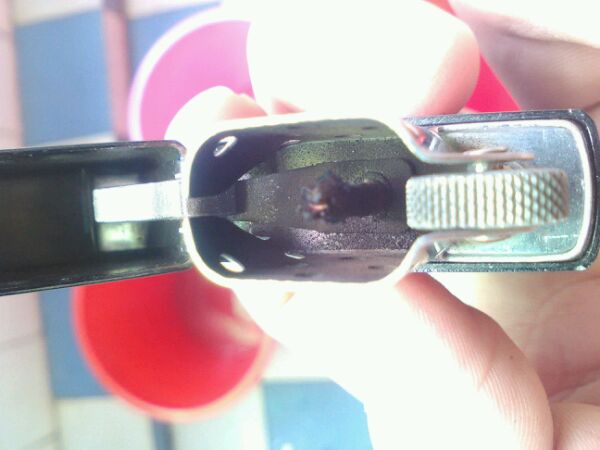 烧黑了点火要是正常的话就不要管它,如果火苗很小了就用钳子把棉芯拉上来一点,把黑的部分剪掉就可以了,铰链有一点点松动是正常的