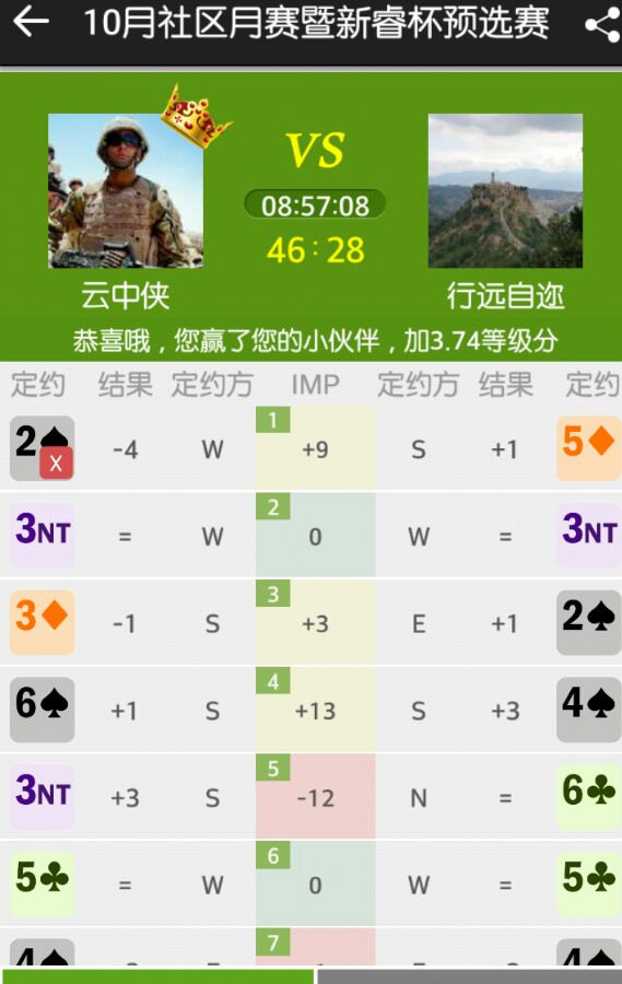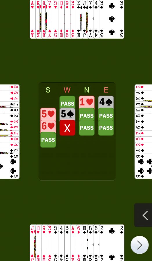 最后一副,OPP争到5S时我估计打不下,同时3张小S暗示同伴S缺门,在如此有利的局况下勇敢牺牲6H-1,勇气得到回报——对手让打5S+1——13IMP