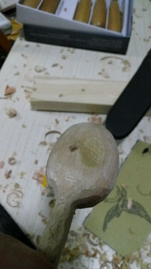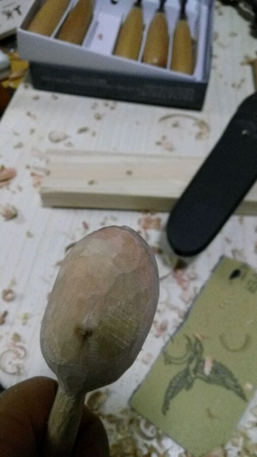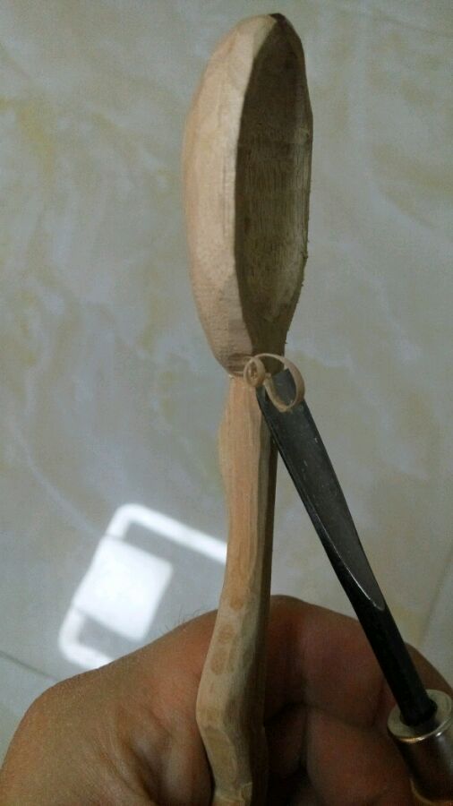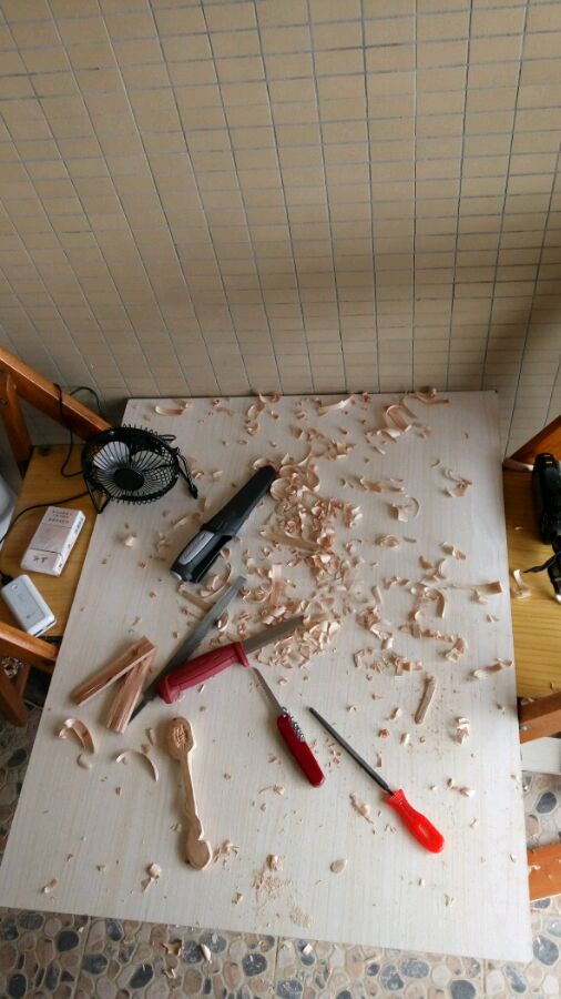 然后挖勺子坑,没工具,用刀尖一阵啄,可是,这效果没法看啊,这得啄到啥时候去啊?而且最后怎么收尾?罢了,歇工,胡乱操莫拉去了。背敲劈木,这种胶合的拼接板(是叫免漆板吗?),劈得进去,但是到一定深度就很难劈开了,估计各部位胶水粘合太牢的缘故,没原木方条那么好对付。