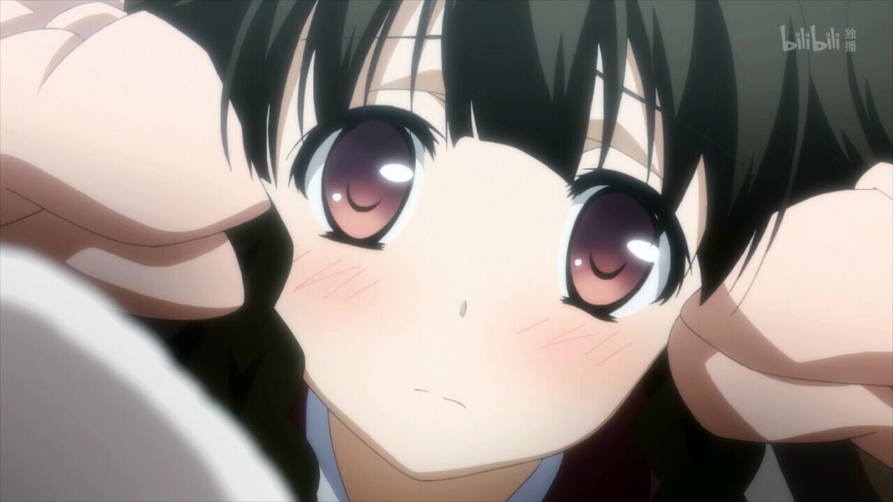 大致一看的话,游戏中的眼角和眉毛是向下的,嘴角亦然。营造出没自信和楚楚可怜的气质,动画里的眼睛完全是圆的,气质方面完全不同了。