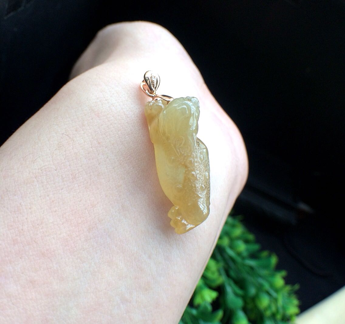 超精致冰黄小金蟾,配18k玫瑰金钻扣,种老水头足,雕工非常细致,左边肚子色浅偏白,不影响,没有纹裂!尺寸26.5*10*12mm,1500包邮带证书!