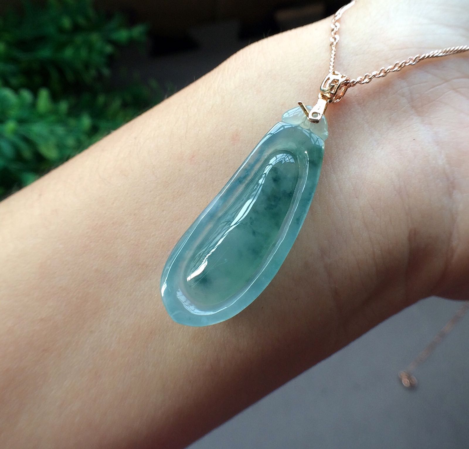 飘蓝花福瓜,上手飘花非常漂亮,种细料子好,很水润,没有瑕疵和纹裂!尺寸35*13.2*7.2mm,1400包邮带证书,配图上玫瑰金扣!