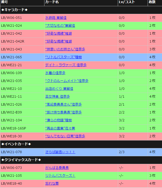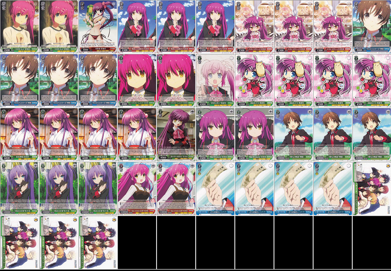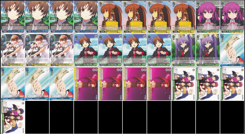Little busters是WS的始祖系列之一。拥有WS中第二大的卡池,组法很多。旧盒子中有很多迷之科技,不过大多卡已经跟不上时代,许多构筑消失在时光潮流之中。随着TV盒子的到来加上RF和CM两个必闪的强化,LB再次跻身一线卡组之列,3个新盒子补足了各种上位必备的新科技:L0检索、L1潮联检索、L3射血、L3武藏、回血封、回收封、免伤刀、赚手集中。