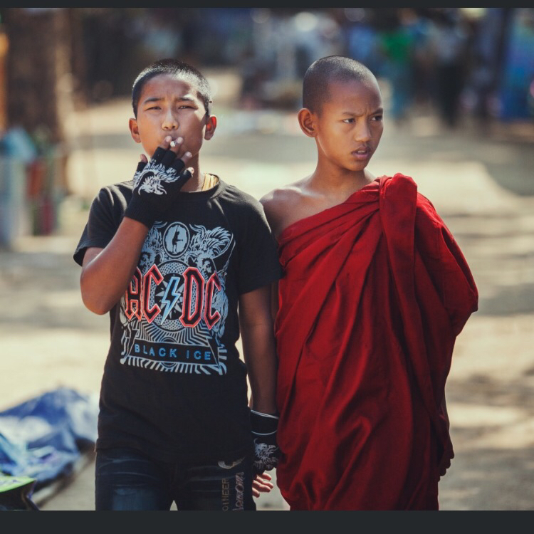 如题,一个小和尚被一个朋克男孩牵着的照片,好人一生平安