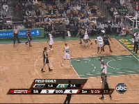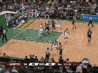 既然帕克缺战,马刺外线就只有马努一台发动机了,绿凯对马努全场采取上线包夹、延阻的战术(是这么说吧?),不过马努今天比较横,一个变向趁对方内线回防的时候杀进去博得犯规。奥博托那一下掩护看着比较玄乎,在马努突进去的时候,左腰的邓肯也适时从中路拉到外线,意在掩护+牵制防守人。