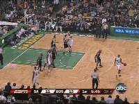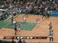 既然帕克缺战,马刺外线就只有马努一台发动机了,绿凯对马努全场采取上线包夹、延阻的战术(是这么说吧?),不过马努今天比较横,一个变向趁对方内线回防的时候杀进去博得犯规。奥博托那一下掩护看着比较玄乎,在马努突进去的时候,左腰的邓肯也适时从中路拉到外线,意在掩护+牵制防守人。我想起游戏解说界的一句名言:这一炮有一万多个细节。嗯,这一攻也有一万多细节。